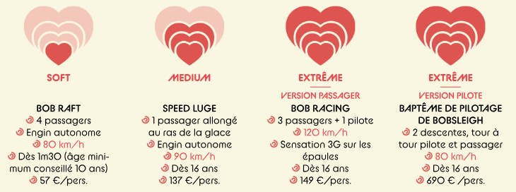 Développés suite aux Jeux olympiques de 1992, le Bob Raft et la Speed Luge n’ont cessé de faire leurs preuves sur cette piste mythique ; ces deux engins sont des exclusivités et inventions La Plagne. De gauche à droite : Bob Racing - Bob Raft - Speed Luge